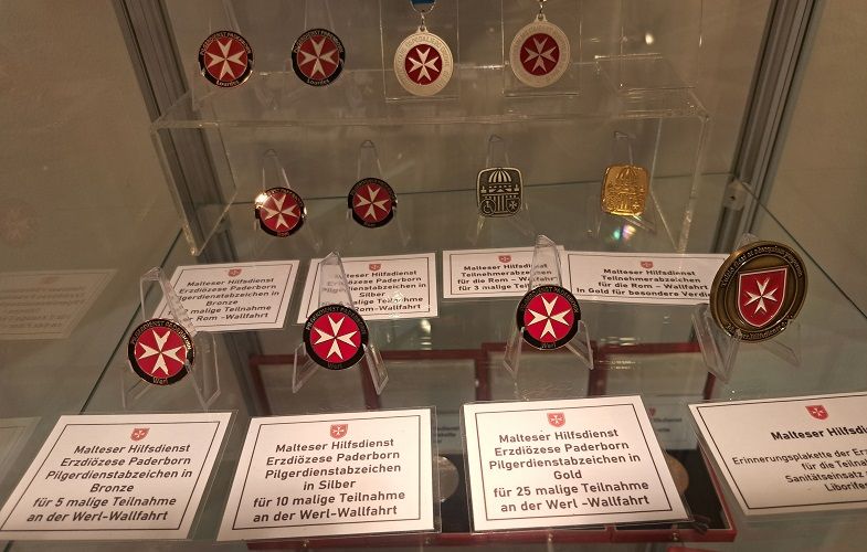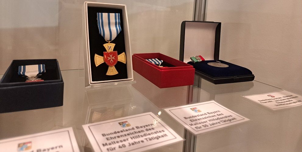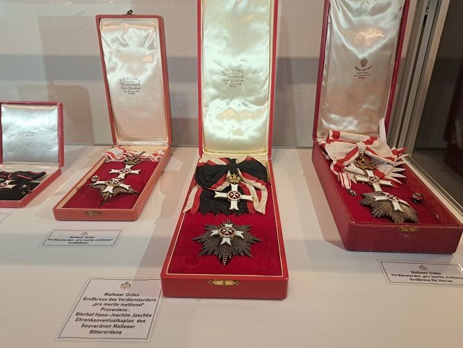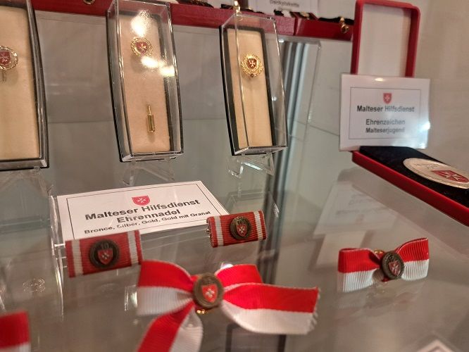 Blickfang jeder Ausstellung sind aber die Ordensdekorationen und Auszeichnungen. Sowohl die Auszeichnungen des Ordens, als auch des Malteser Hifsdiest e.V. sind fast vollständig vertreten.